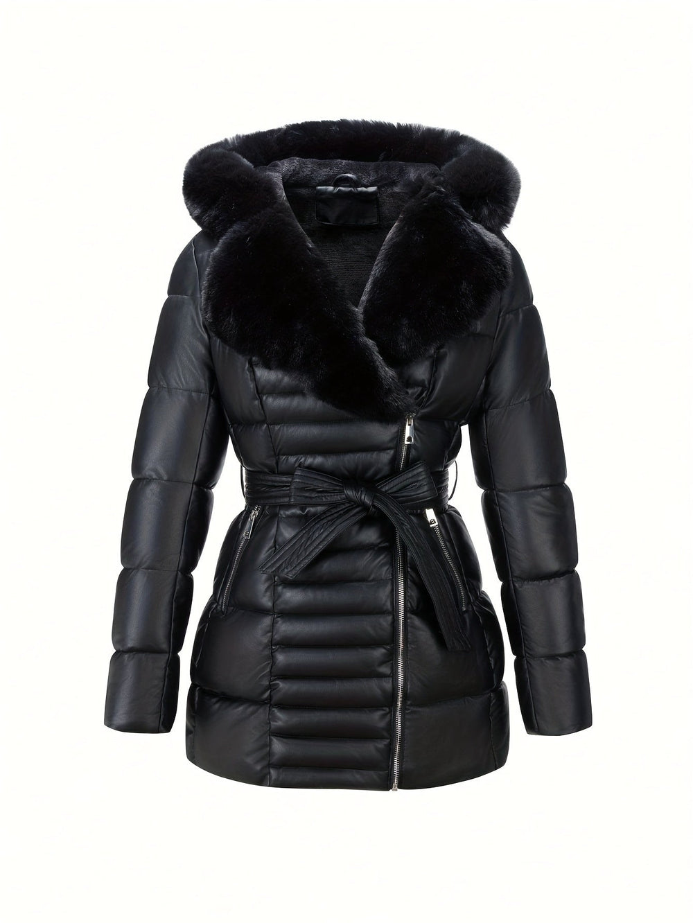 Ingrid – Elegancka damska wegańska kurtka skórzana z kapturem z sztucznego futra i detalem w postaci paska