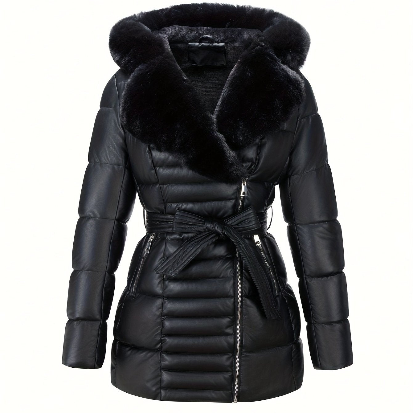 Ingrid – Elegancka damska wegańska kurtka skórzana z kapturem z sztucznego futra i detalem w postaci paska